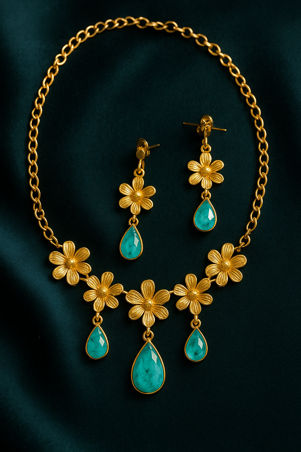 Conjunto elegante de colar e brincos com motivos florais dourados e pingentes turquesa. Feitos com liga de metais dourados hipoalergénicos, o colar ajustável e os brincos complementam qualquer look formal ou casual. Perfeito para ocasiões especiais ou para dar um toque de brilho ao dia-a-dia.