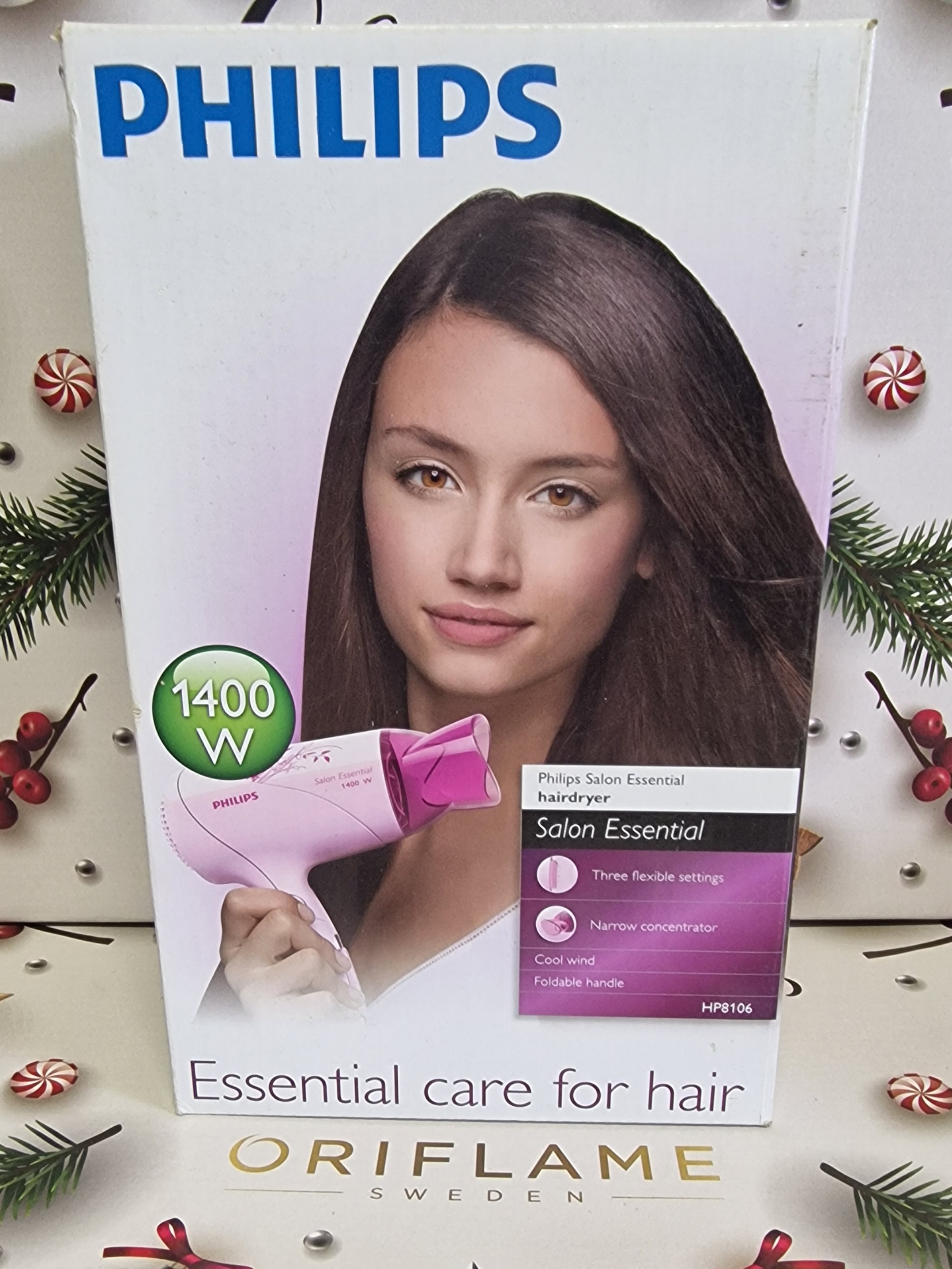 Secador de cabelo portátil Philips Salon Essential com potência de 1400 W. Design compacto e pega dobrável para fácil transporte. Proporciona secagem suave e rápida, com 2 velocidades/temperaturas e bocal concentrador para modelação precisa. Ideal para viagens e uso diário.
